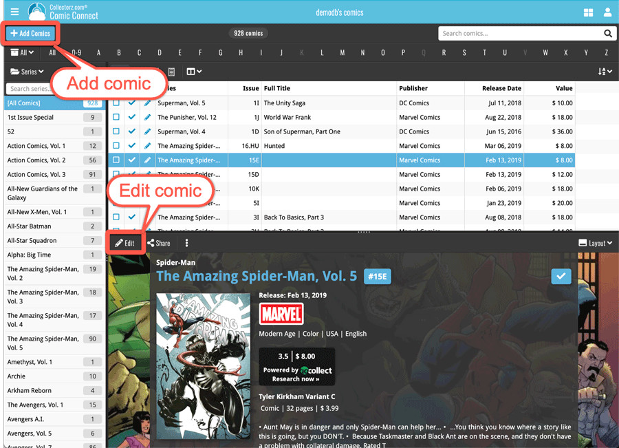 Comic Connect is full featured and fully customizable comic database software, with a user interface that has been designed to be clean, intuitive and super easy-to-use.